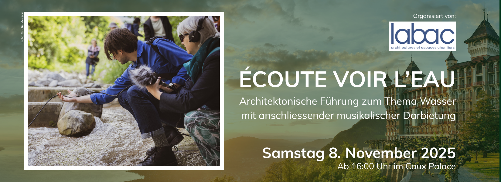Seit März hat die labac gemeinsam mit den Einwohnerinnen und Einwohnern der Region die Bedeutung des Wassers in unseren bebauten und natürlichen Räumen in Montreux untersucht. Zum Abschluss dieser partizipativen Klangkartografie laden wir Sie am Samstag, 8. November 2025, ab 16 Uhr in den Caux Palace zu einer Architekturführung zum Thema Wasser ein. Zum Abschluss des Projekts «Ecoute-voir l’eau: Eine partizipative Klangkartografie» erwartet Sie eine einzigartige Musikperformance von Dragos Tara, die auf den während der Spaziergänge gemachten Aufnahmen basiert.