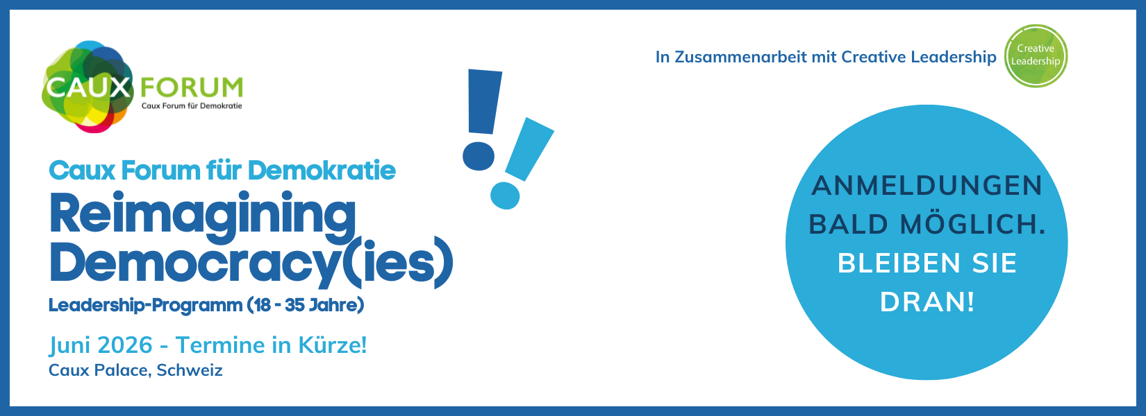 Dieses von Creative Leadership organisierte Programm findet parallel zum Caux Democracy Forum statt, bei dem 28 junge Changemaker zusammenkommen, um Demokratie(n) zu überdenken, Macht neu zu definieren, drängende globale Herausforderungen zu erforschen und gemeinsam zu versuchen, die Narrative, die unsere Gesellschaften prägen, durch reflektierende Räume des Lernens/Verlernens, des Geschichtenerzählens, des Dialogs und der Kunst neu zu schreiben.