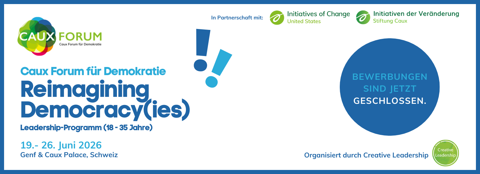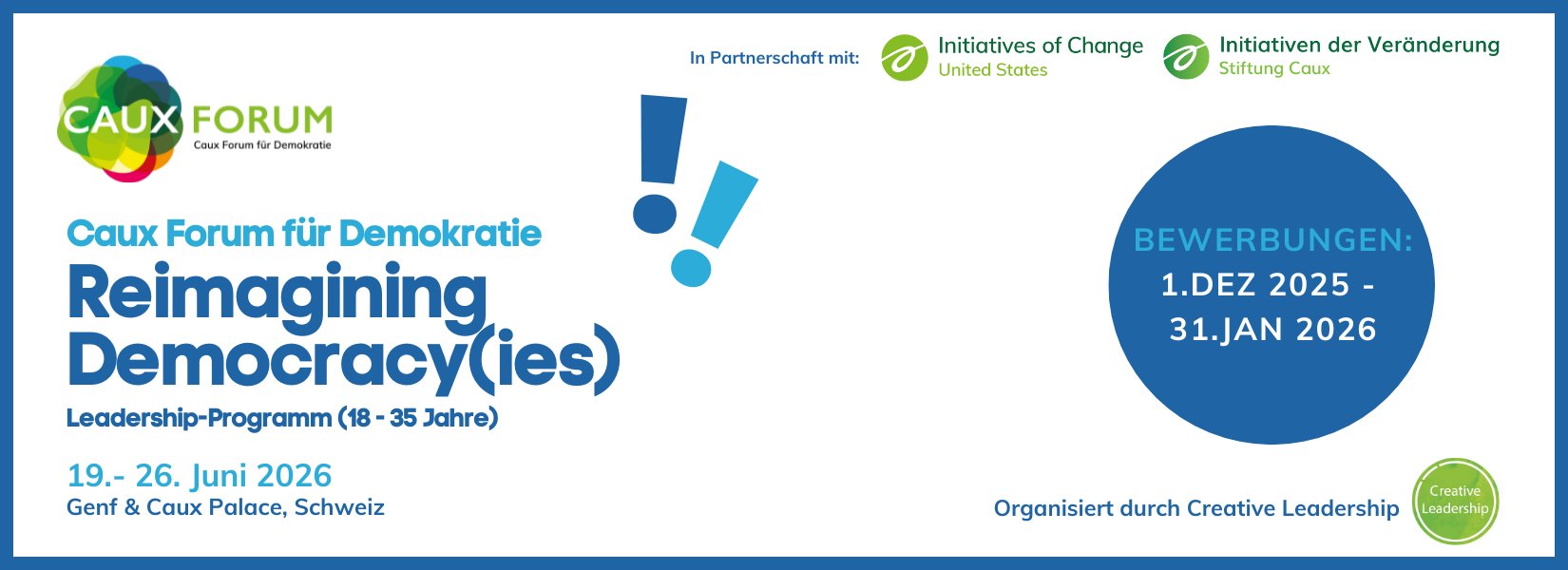 - 22. bis 26. Juni: Fortsetzung von „Reimagining Democracy(ies)” im Caux Palace parallel zum Caux Forum für Demokratie