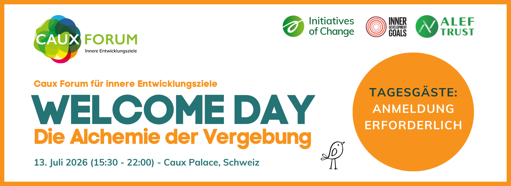 - Wenn Sie sich für das gesamte Caux Forum für innere Entwicklungsziele anmelden, ist die Teilnahme am Welcome Day inbegriffen.
