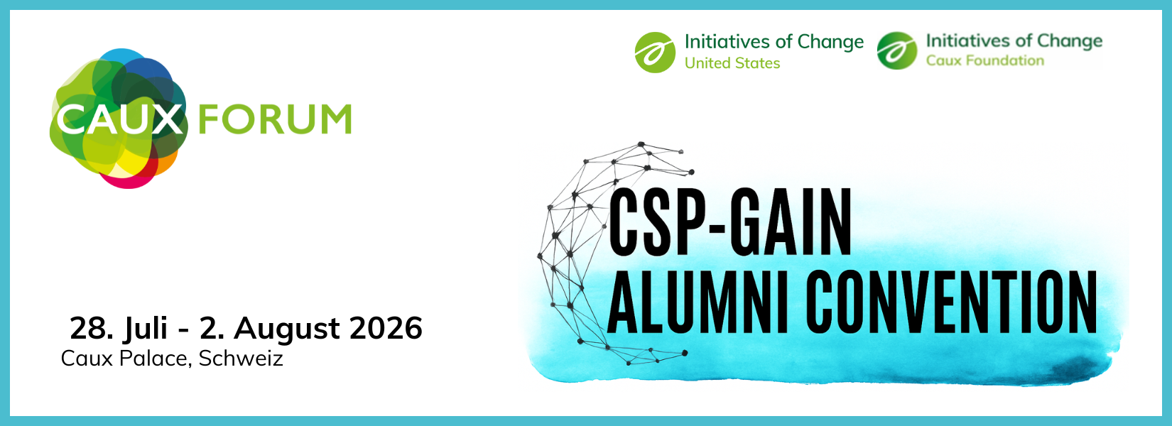 Die CSP–GAIN Alumni Convention (28. Juli - 2. August 2026) bringt Caux Scholars aus den letzten drei Jahrzehnten zu einem globalen, generationsübergreifenden Treffen im Sommer 2026 in Caux/Schweiz, zusammen. Diese besondere Zusammenkunft steht ausschliesslich Alumni des Caux Scholars Program sowie Dozent.inn.en, Facilitator.inn.en, Koordinator.inn.en und Partnerorganisationen offen, die zur Entwicklung des Programms beigetragen haben.