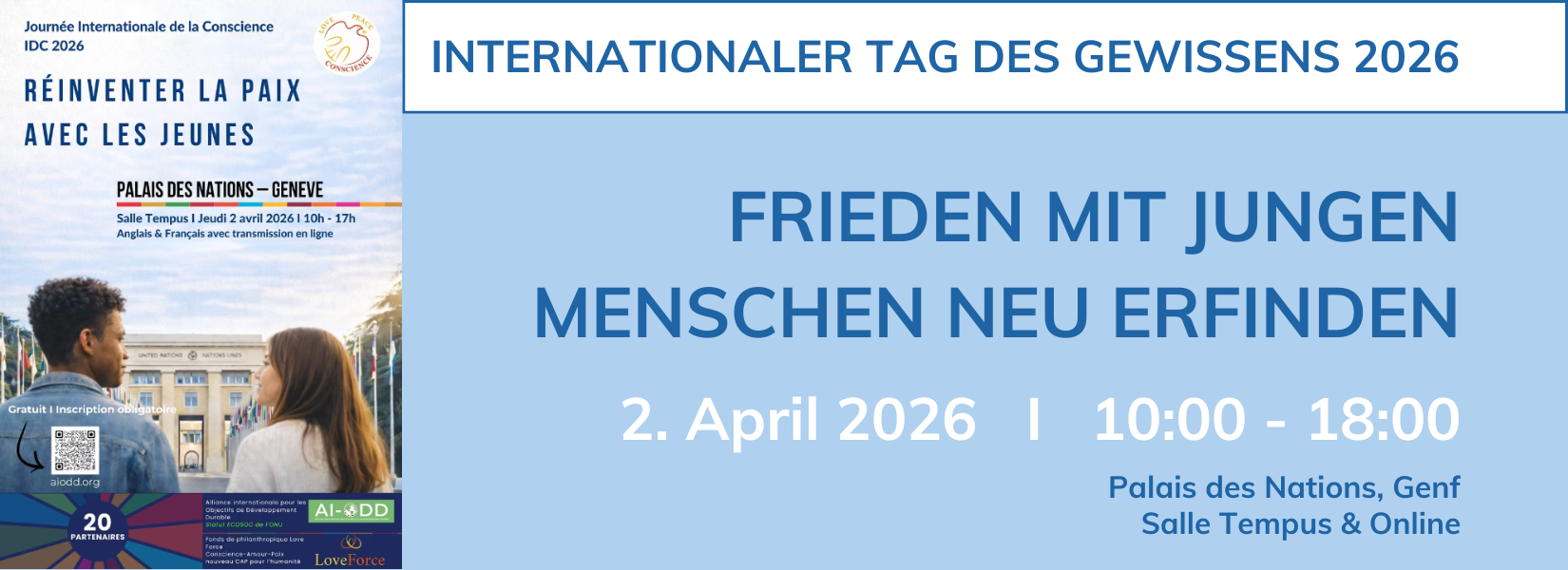 Am 2. April 2026 lädt der Internationale Tag des Gewissens 2026 im Palais des Nations in Genf, der weltweit übertragen wird, Bürger.innen, junge Menschen, Institutionen und Akteur.inn.e.n der Zivilgesellschaft dazu ein, sich in einem globalen Aufruf zu vereinen, um das Bewusstsein zu schärfen und sich für den Frieden zu entscheiden.