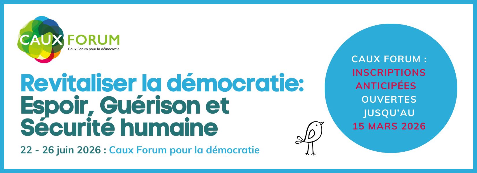 Rejoignez-nous à Caux, en Suisse, du 22 au 26 juin 2026 pour la troisième édition du Caux Forum pour la démocratie, avec une Cérémonie d'ouverture spéciale à la Maison de la Paix à Genève (22 juin). La bonne nouvelle ? Les tarifs préférentiels pour les inscriptions anticipées sont encore disponibles jusqu'au 15 mars 2026.