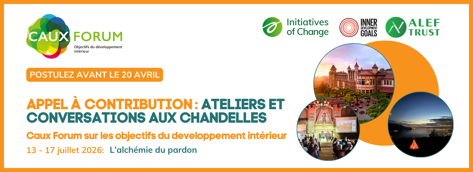 Les ateliers pourront également explorer les liens entre le pardon et les thèmes du développement intérieur, de la transformation sociale et de la responsabilité écologique, en s’inspirant des travaux de l’International of Change, de la Inner Development Goals Foundation et du programme Nurturing the Fields of Change de l’Alef Trus.