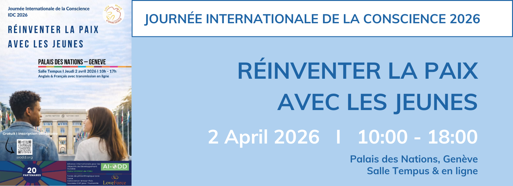 La Journée internationale de la conscience 2026 est organisée par la Fondation LoveForce et l'Alliance internationale pour les objectifs de développement durable (AI-ODD), et nous sommes ravi.e.s de nous associer une nouvelle fois à cette initiative internationale, en rejoignant une puissante coalition de représentants des Nations unies, de fondations, d'ONG, d'artistes, d'universitaires, de lauréat.e.s du prix Nobel de la paix et de jeunes leaders et leadeuses engagé.e.s dans la promotion de la paix par le dialogue, la conscience et l'action collective (découvrez le programme).