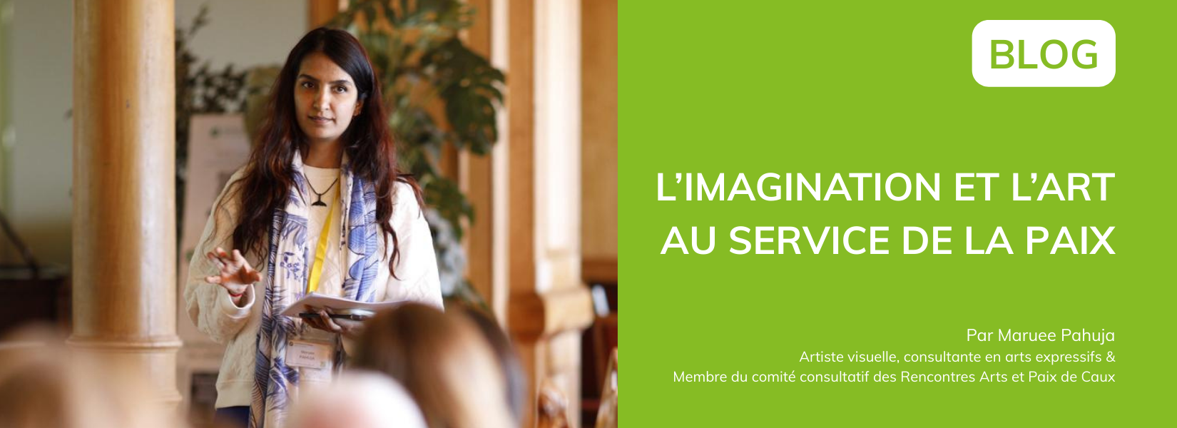 Maruee Pahuja (Inde) travaille à la croisée des arts, des sciences et des relations humaines. Praticienne en soins oculaires, artiste visuelle, consultante en arts expressifs et facilitatrice, elle explore comment la créativité peut enrichir nos perspectives et favoriser l'empathie, la santé et le chemin vers la paix.